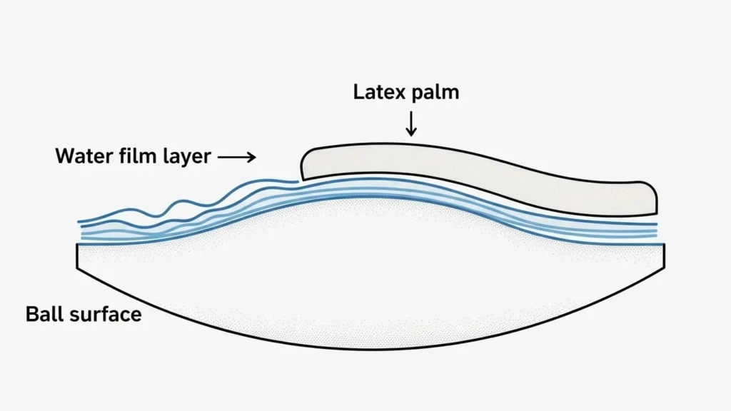 That film acts like lubrication. Even if the glove feels tacky, the ball can hydroplane on a microscopic level. The result is less real contact area, less friction, and less control and grip.